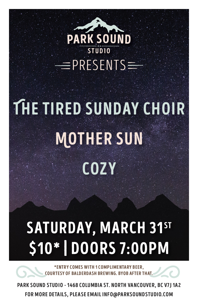 Park Sound Presents is a monthly musical showcase hosted at Park Sound Studio featuring 3 local acts. On Saturday, March 31st we’re hosting The Tired Sunday Choir, Mother Sun and cozy.