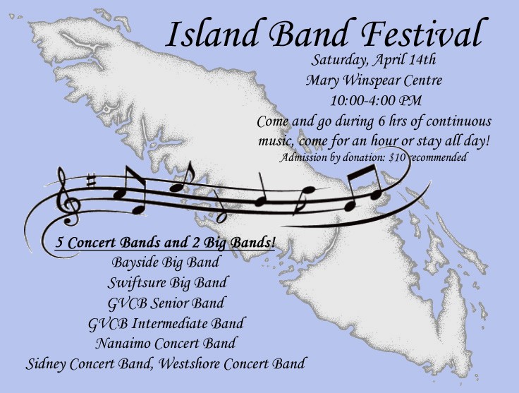 Island Band Fest: Greater Victoria Concert Band (Senior and Intermediate), Bayside Big Band, Sidney Concert Band, Swiftsure Big Band, Westshore Concert Band, Nanaimo Concert Band