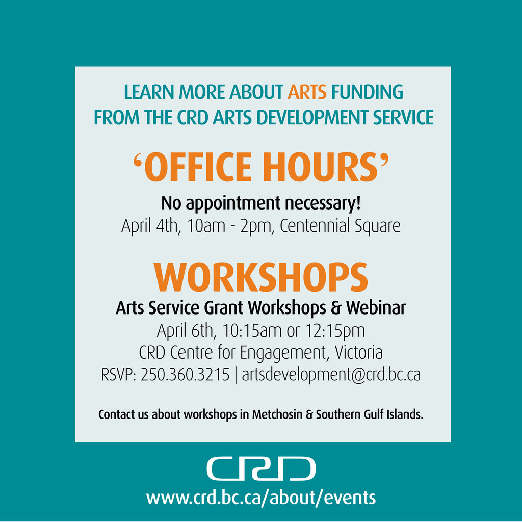 Does your organization have an arts project idea for the Capital Region? Want to learn more about the application process and eligibility for CRD arts funding? Visit the CRD Arts Service booth in Centennial Square during public ‘Office Hours’.