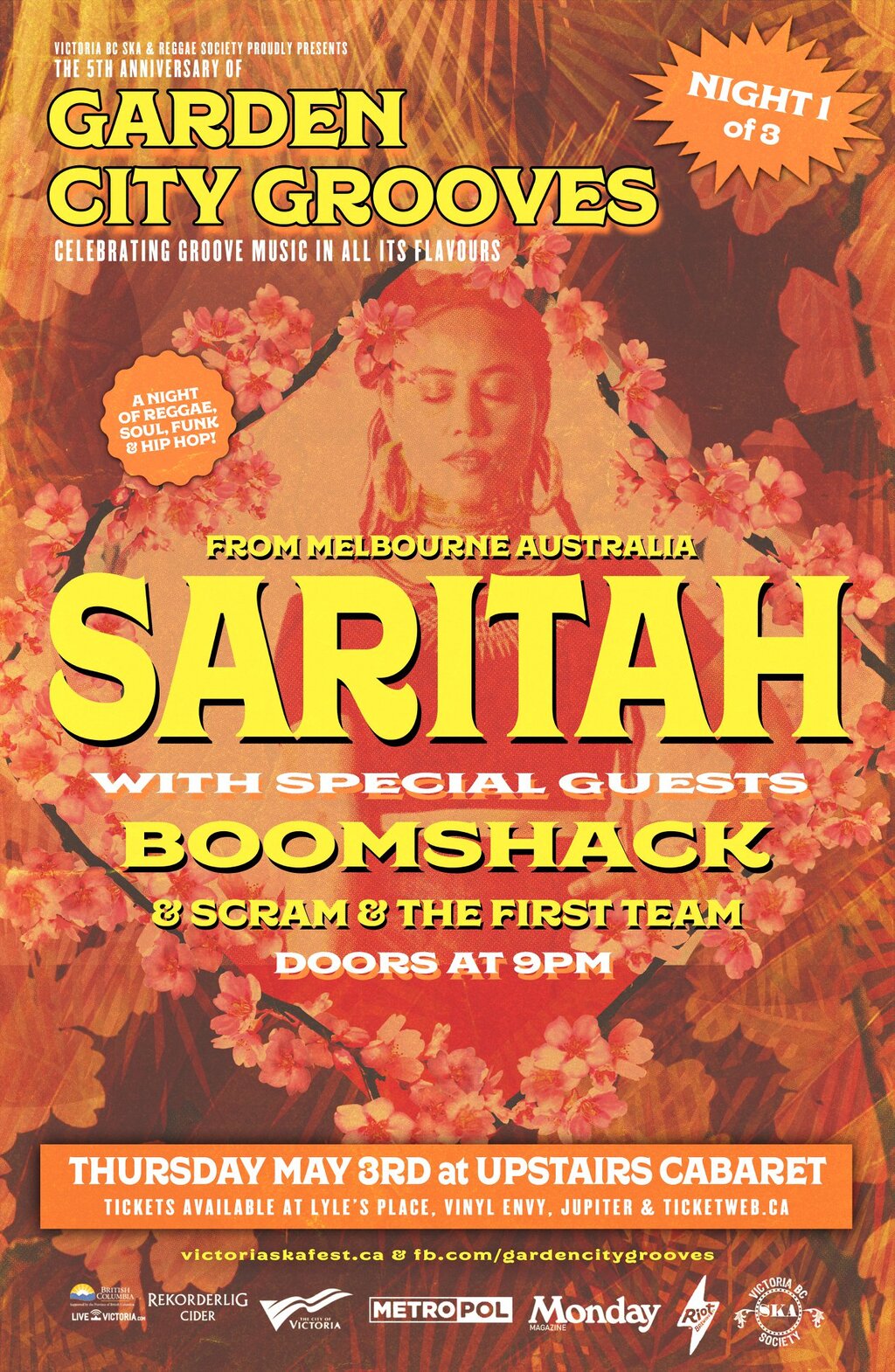 GCG takes flight with an evening of reggae, soul, funk and hip-hop at Upstairs Cabaret. Australian singer Saritah makes her Victoria debut. Saritah delivers a potent combination of feminine spirit, conscious lyrics and heartfelt melodies, whilst embodying a unique union of roots, reggae, soul, and dancehall. Nanaimo’s Boomshack and their energetic blend of soul, funk and reggae add some island flavour to the mix in addition to the live hip-hop stylings of Scram & The First Team that have members of The Leg Up Program and Ill and I (Alex Miller, Kady Savard, Daniela Jackson & Bobby Arson).