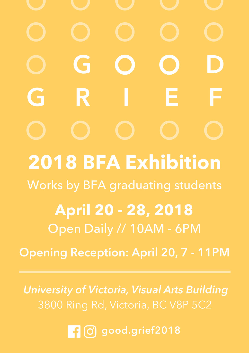 UVic's BFA undergraduates are excited to present 'Good Grief,’ an exhibition featuring 38 emerging artists with over 50 gallery ready works. This exhibition is occurring in conjunction with the 50th anniversary of the Department of Visual Arts at Uvic. This offers a chance to view the work of UVic’s undergraduate class of 2018 and showcases a wide range of projects from painting, drawing, sculpture, photography, digital media and multimedia work. Come join us for an evening of art and meet the artists behind the work. The evening will be catered and licenced, and there will be both alcoholic and non-alcoholic beverages for purchase at our cash only bar. Publications will also be available for purchase.