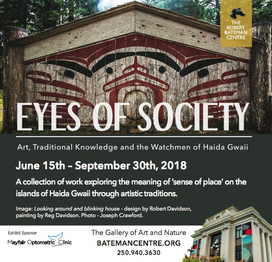 Eyes of Society features the artwork of April White, Anja Karisik, Sophie Lavoie, Jim Hart, Gwaai Edenshaw, Jaalen Edenshaw, Gary Landon, Andrew Sookrah, W. David Ward, and Robert Bateman.The exhibit also features the documentary Eyes of Societyby Joe Crawford and Allison Smith of Braid Films.