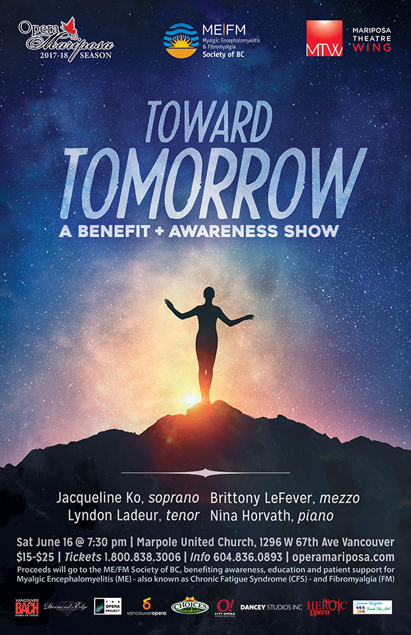 Opera Mariposa and the Mariposa Theatre Wing present an evening of beautiful music for a great cause! In the gala benefit concert Toward Tomorrow, award-winning singers Jacqueline Ko, Brittony LeFever and Lyndon Ladeur and pianist Nina Horvath perform opera, Broadway and more in support of the ME/FM Society of BC. Join this all-star cast for hit songs from The Magic Flute, West Side Story, Hamilton, Dear Evan Hansen and more. The evening also includes a dessert buffet, plus a charity raffle contest with over $2,000 in prizes.