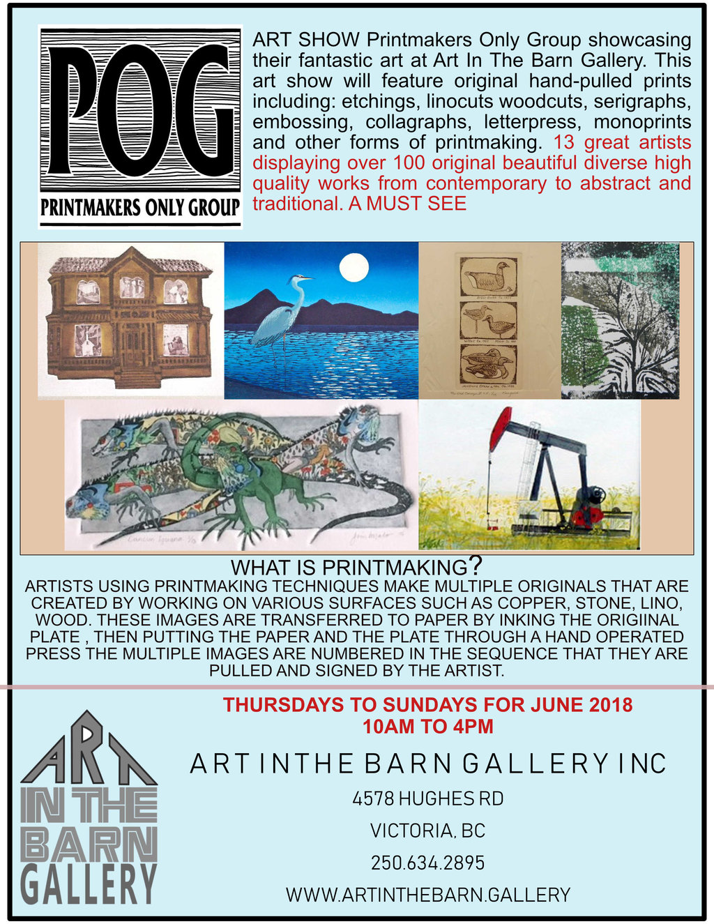 ART SHOW Printmakers Only Group showcasing their fantastic art at Art In The Barn Gallery. This art show will feature original hand-pulled prints including: etchings, linocuts woodcuts, serigraphs, embossing, collagraphs, letterpress, monoprints and other forms of printmaking. 13 great artists displaying over 100 original beautiful diverse high quality works from contemporary to abstract and traditional. A MUST SEE