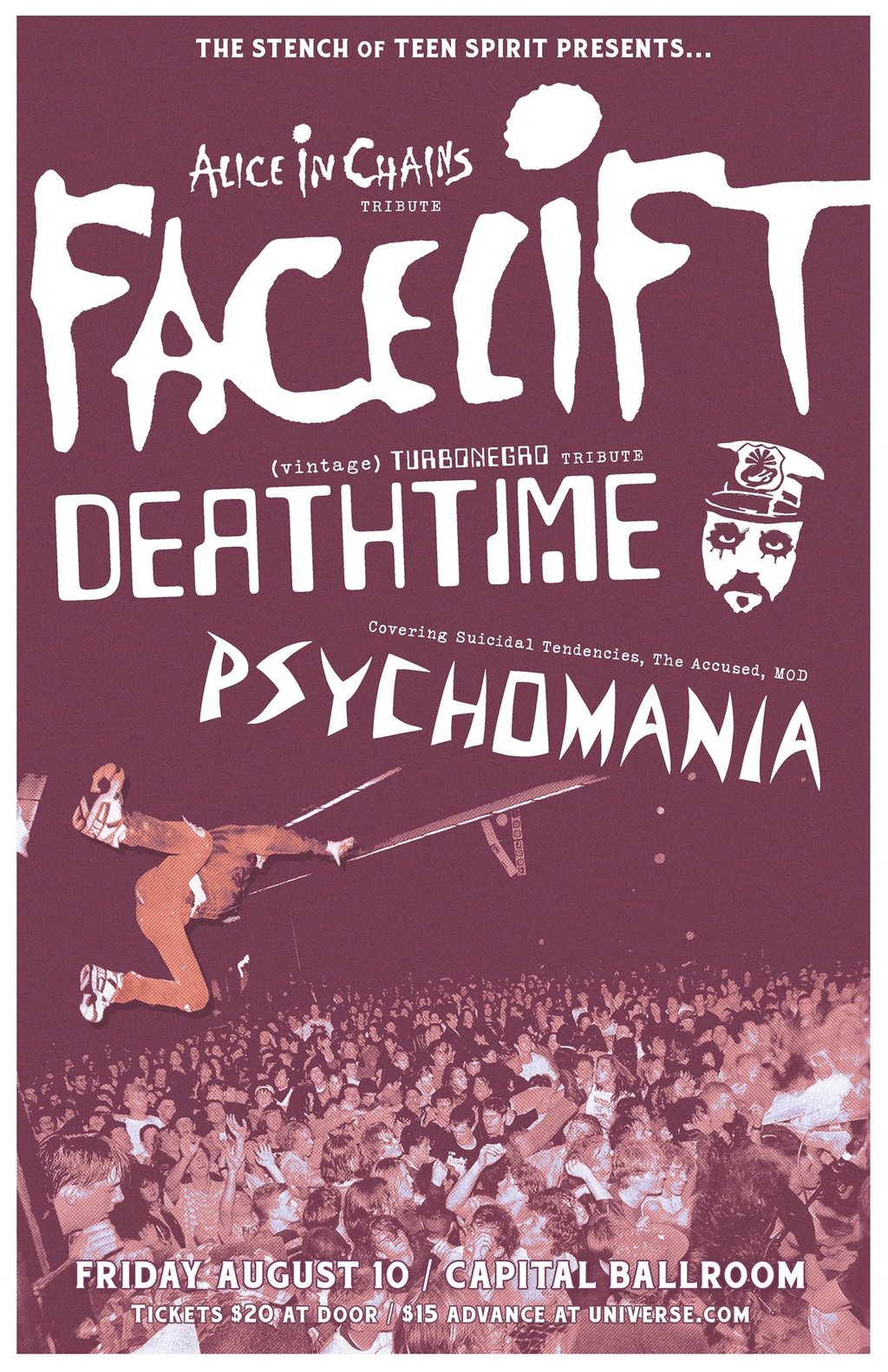 Tribute Show: Facelift (Alice n Chains Tribute), DEATHTIME  (Turbonegro Tribute), Psychomania (The Accused, DRI, Suicidal, SOD/MOD Tribute) @ Capital Ballroom Aug 10 2018 - Jan 14th @ Capital Ballroom