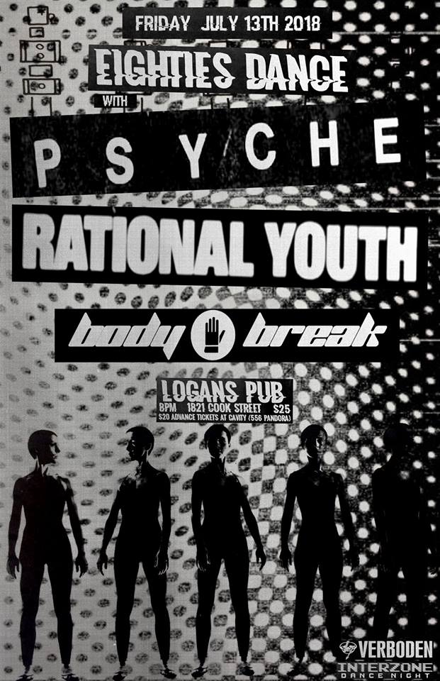 EIGHTIES DANCE!!: Psyche, RATIONAL YOUTH, BODY BREAK, Interzone @ Logan's Pub Jul 13 2018 - Jan 19th @ Logan's Pub