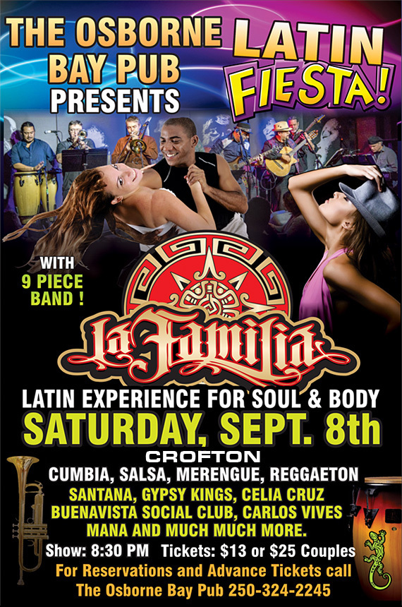 CROFTON. Bring your dancing shoes and tequila goggles. La Familia is coming to the Osborne Bay Pub in Crofton for a special Latin Fiesta Night. If you dig Santana, Gypsy Kings, Buenavista Club, Celia Cruz, Carlos Vives, Mana and like to groove to cumbia, salsa, merengue and reggaeton, come down and Fiesta til you need a Siesta ! Show Starts at 8:30pm. Tickets $13.00 per person or $25 per couple. Advance tickets available at the Osborne Bay Pub in Crofton (250) 324-2245. See you there amigos !