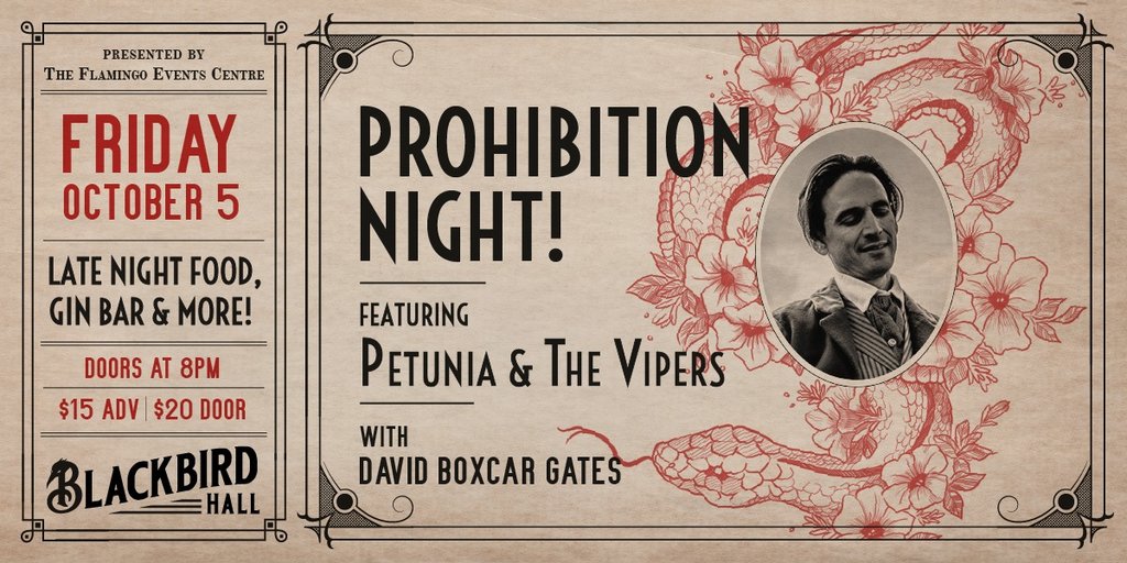 In celebration of Petunia and the Vipers and their unique style of music, we are having a special "Prohibition Night" evening at Blackbird Hall. This will be a night of dancing, speakeasy style gin bar, casino games and more!