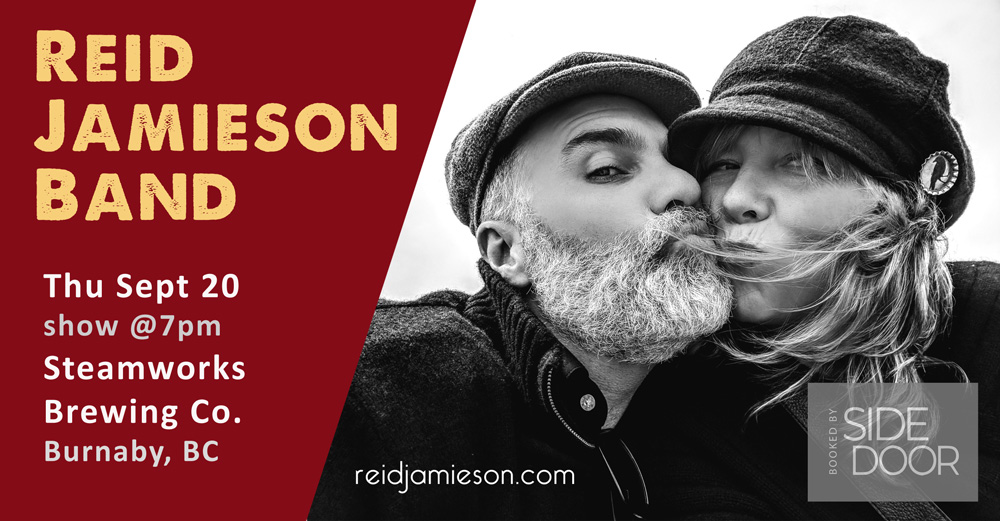 Join the dynamic duo that is Reid Jamieson Band for an intimate and entertaining evening at Steamworks Brewing Co. in Burnaby, BC. Thu Sept 20. A heart-stopping vocal powerhouse, Reid and his feisty missus shine a light with compelling originals, gems from the 50s to the 80s, plus their latest tribute to Leonard Cohen. Tickets for this rare Burnaby show are limited, so act fast! This gig was booked and is hosted by the super swell folks at Side Door – that nifty new entity co-founded by fellow troubadour Dan Mangan and east coast powerhouse Laura Simpson - bless their hearts! Sidedoor celebrates intimate shows, in sweet spaces, where the audience rules.