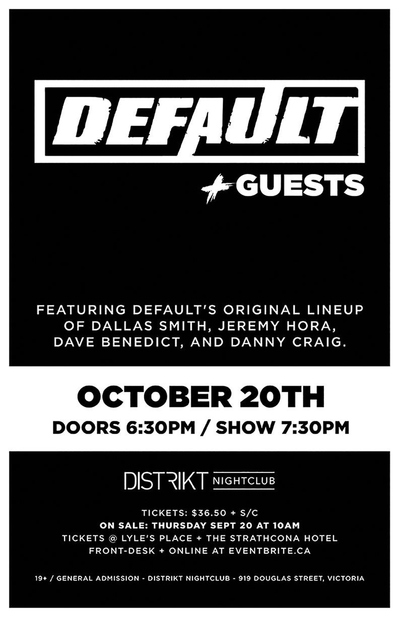 Default has reformed its original lineup of Dallas Smith, Jeremy Hora, Dave Benedict, and Danny Craig. The Band is back together and hitting the road this fall. Tickets go on SALE Sept 20th @ 10 am.