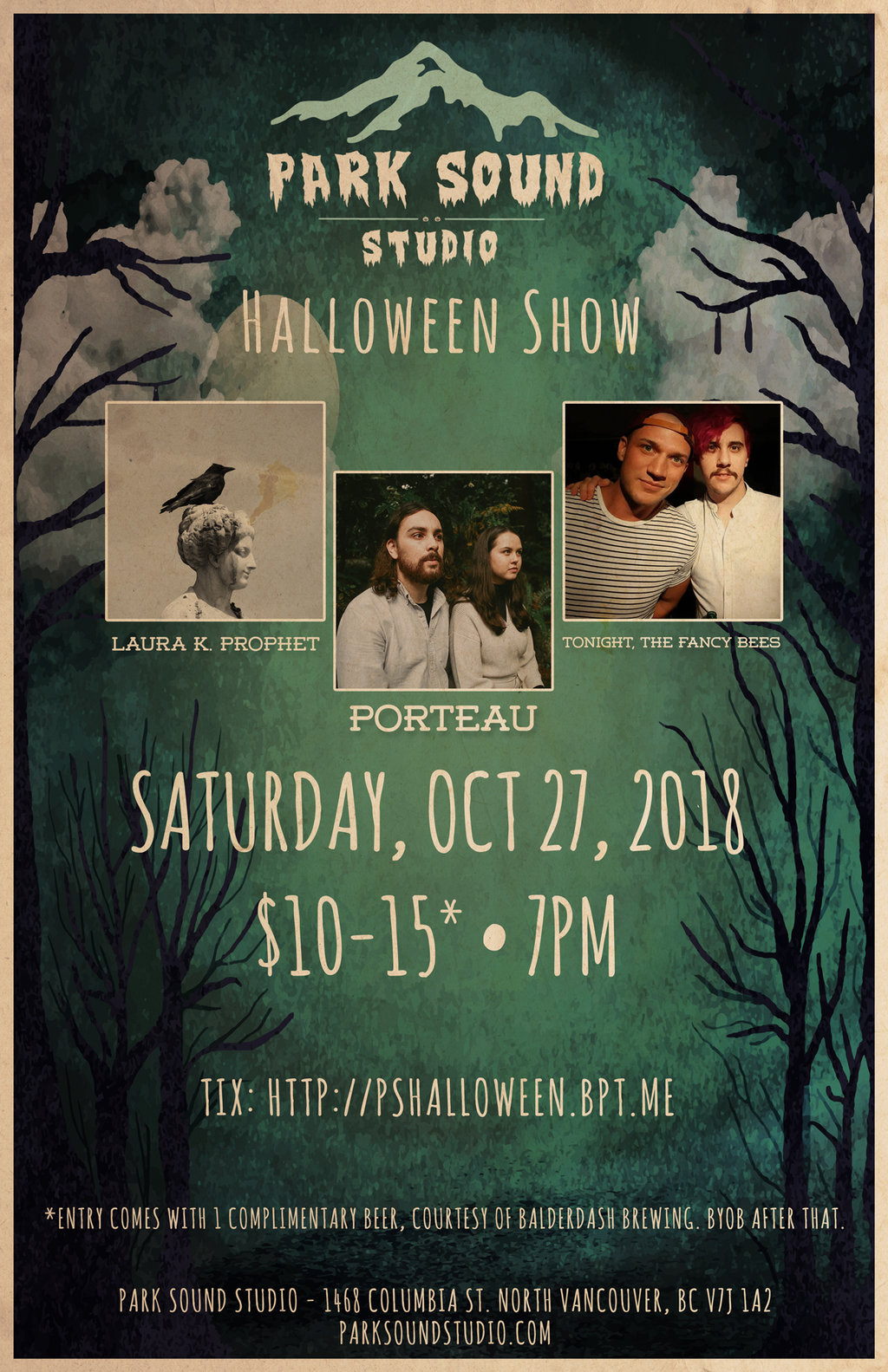 Park Sound Presents is a monthly musical showcase hosted at Park Sound Studio, a recording studio located in North Vancouver. On Saturday, October 27th, we're putting together a special Halloween edition of the show and are welcoming Laura K. Prophet, Porteau, & Tonight, the Fancy Bees to the studio. We'll bring the haunted house vibes, tunes, and candy. You bring the costumes!