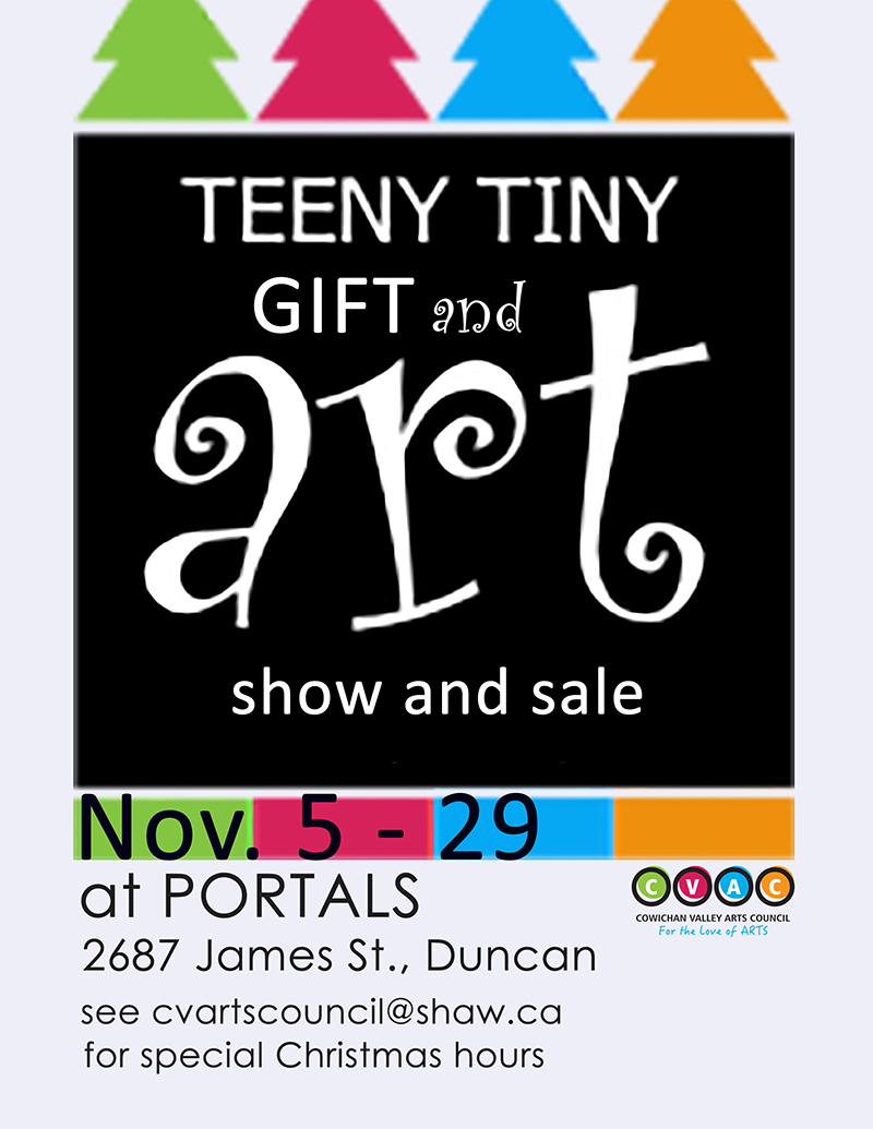 TEENY TINY Art WORKS – A Fine Art Gift Sale featuring Cowichan Valley Arts Council members. 2D works 8"x8" and smaller; 3D works 8"x8"x8" and smaller.