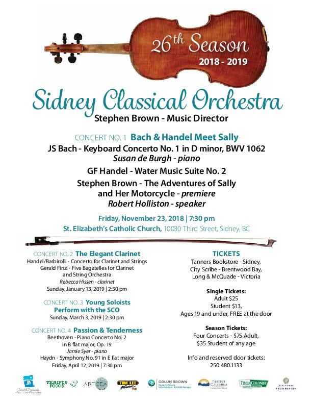 Bach & Handel Meet Sally: Sidney Classical Orchestra, Susan de Burgh - piano, Stephen Brown - conductor, Robert Holliston - speaker @ St Elizabeth's Catholic Church, 10030 Third Street, Sidney, BC Nov 23 2018 - Feb 25th @ St Elizabeth's Catholic Church, 10030 Third Street, Sidney, BC