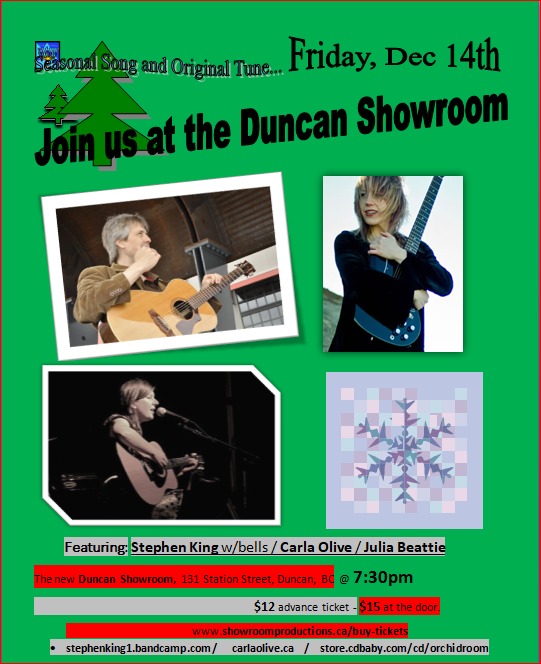 An intimate evening of seasonal song, mirth and original tunes. Three unique voices and songwriters come together for their first holiday performance in Duncan, BC. Music from the 16th century to present...