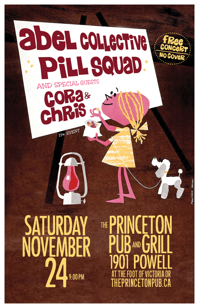 The Princeton Pub hosts the return of abel collective (formerly known as abel); with special guests Pill Squad, and Cora&Chris (the Burnettes). Music starts 9:30pm and as always, shows at the Princeton are absolutely ***FREE***