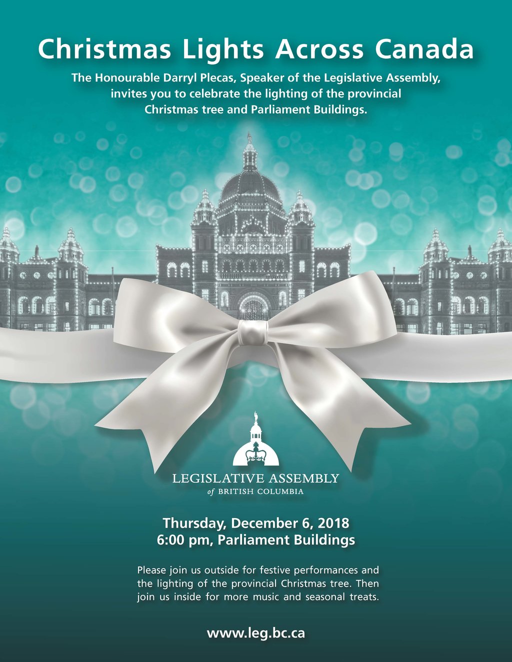 Come to listen to the local choirs and help us countdown the light up of the Legislature. Everyone is invited inside for free hot chocolate, hot apple cider and cookies while listening to another choir and Reynolds Secondary School Carol Band.