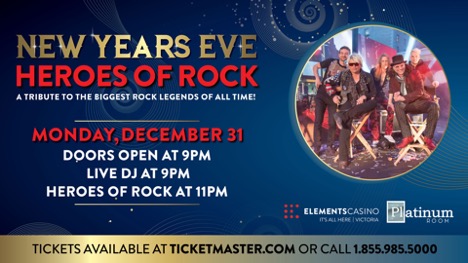Rock in the New Year with the Heroes of Rock! Come into Elements Casino on Dec 31st and experience the iconic hits of AC/DC, Guns N' Roses, Led Zeppelin, and more! Tickets are available this Friday for only $69.50 and include a live DJ, delicious canapés, party favours, and champagne toast!