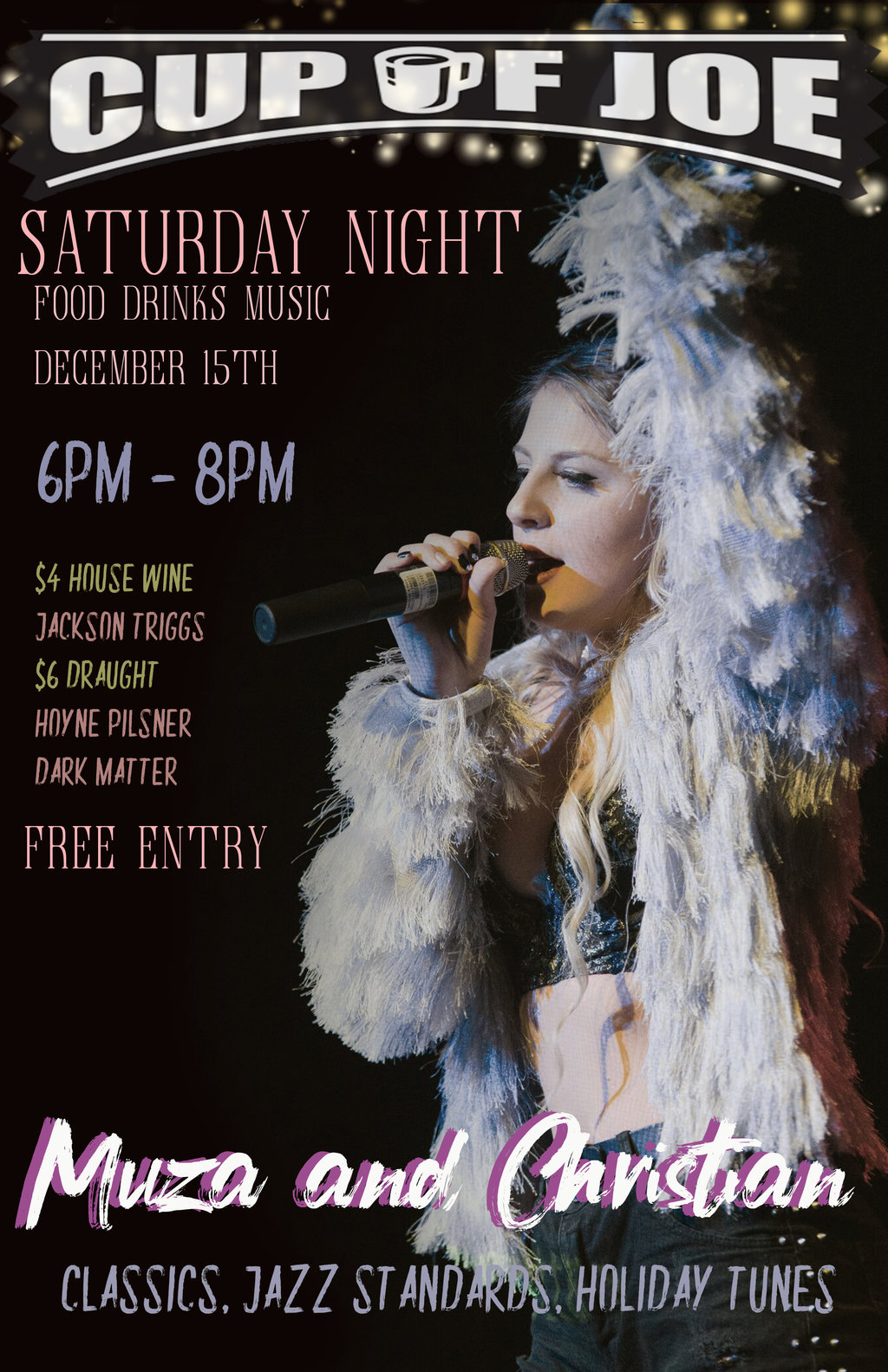 Live Music Saturday Nights: Muza and Christian @ cup of joe Dec 15 2018 - Jan 18th @ cup of joe
