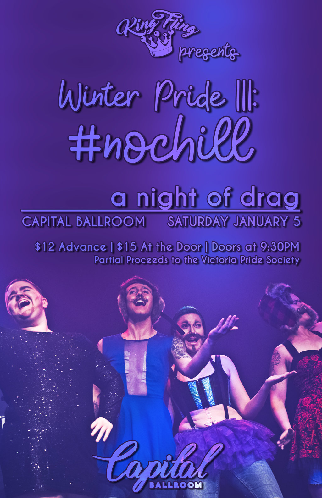 No need to wait til summer to party with Pride cause Victoria's premier Drag King night and queer folks & friends dance party is bringing you WINTER PRIDE III: #NOCHILL on Saturday, January 5, 2019, at Capital Ballroom! Join us and the rest of the #yyjdrag family for incredible performances from some of Victoria's premier Kings, Queens, and Things, not to mention an amazing dance party with DJ Yeezy Yee!! Our awesome merch booth will be back too, with all kinds of queer goodies for any budget, PLUS Drag Bucks to tip the performers who really wow you!