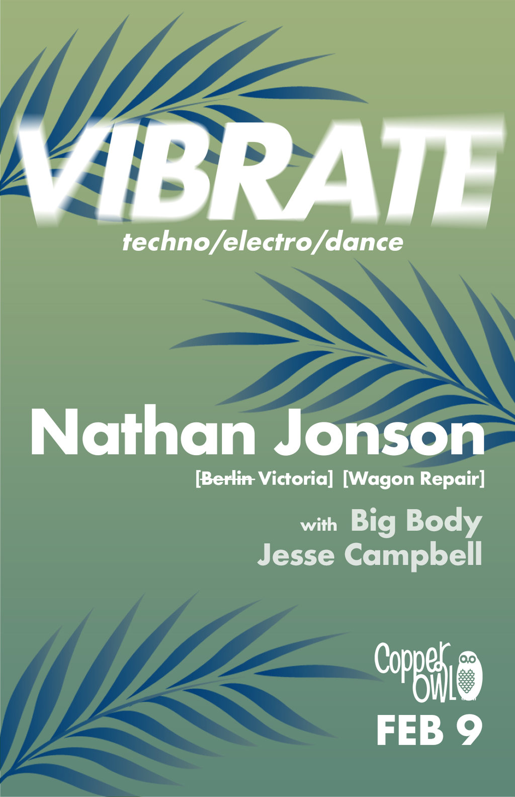 We're very excited to have our first guest Nathan Jonson joining the Vibrate crew at Copper Owl for a night of quirky techno, spicy electro and whatever the heck else we feel like playing. VIBRATE aims to create a comfortable and safe space to enjoy electronic music, a place to share new music and explore new sounds, and a chance for up and coming DJs to rinse their tunes. All are welcome.