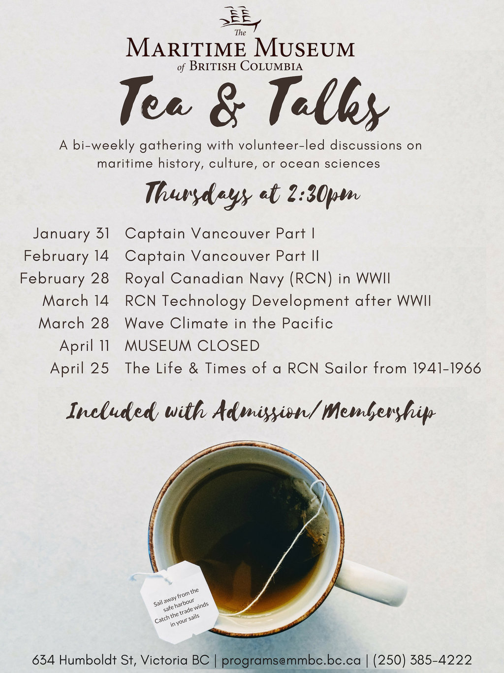 Museum volunteers, archival staff, and educators present unique artefacts from our collection, surrounded by discussions of maritime history and other seaworthy topics – all over a cup of tea and refreshments!