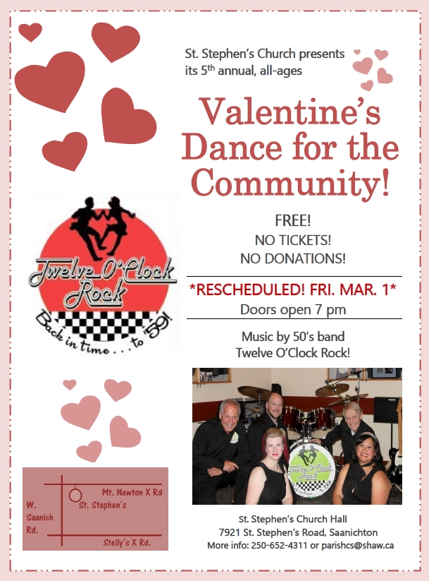 St. Stephen's presents is 5th annual, all ages Valentine's Dance! Free admission: no tickets, no donations! RESCHEDULED DUE TO WEATHER CONDITIONS! NEW DATE: FRIDAY, MARCH 1ST!