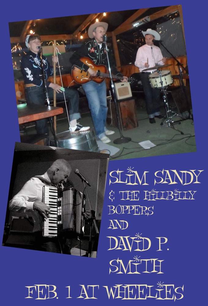 Slim Sandy and the Hillbilly Boppers return to rock Wheelies. Victoria underground music legend David P. Smith opens the night.