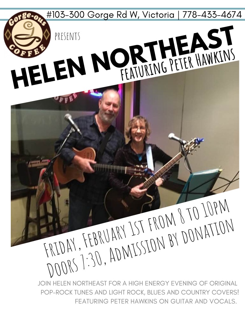 Join Helen Northeast for a high energy evening of original pop-rock tunes and light rock, blues and country covers! Featuring Peter Hawkins on guitar and vocals.