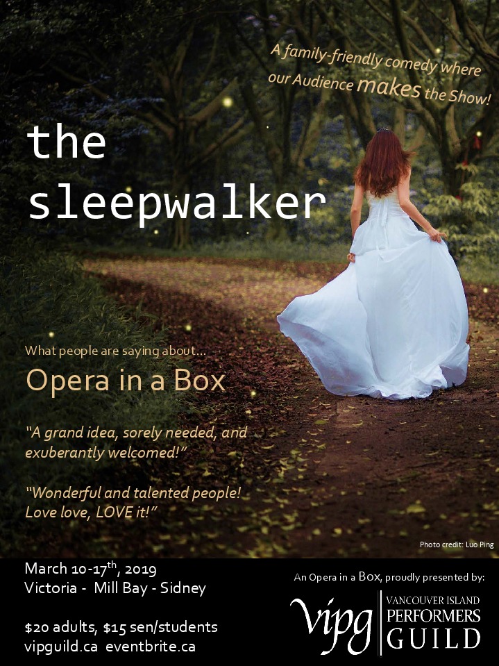 Prepare to experience opera as a part of the show! VIPG presents an Opera in a Box production of The Sleepwalker; a portable, no frills production capitalizing on the dynamic cast and recruitment of the audience to share a comedic folk tale of virtue and trust.