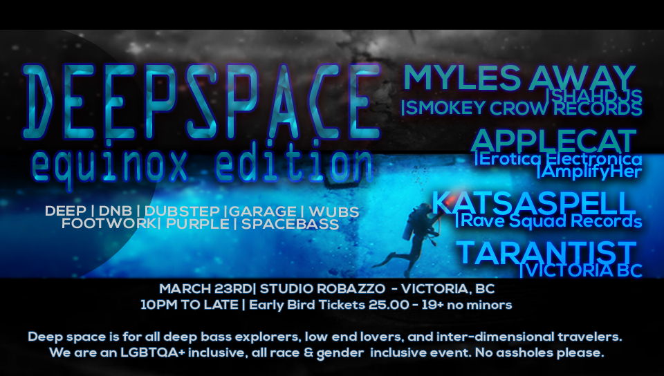 Deep space is for all deep bass explorers, low end lovers, and inter-dimensional travelers. This is an LGBTQA inclusive, all race & gender inclusive, all walks of life, all peoples and creatures inclusive event. I will say it once again, NO assholes.