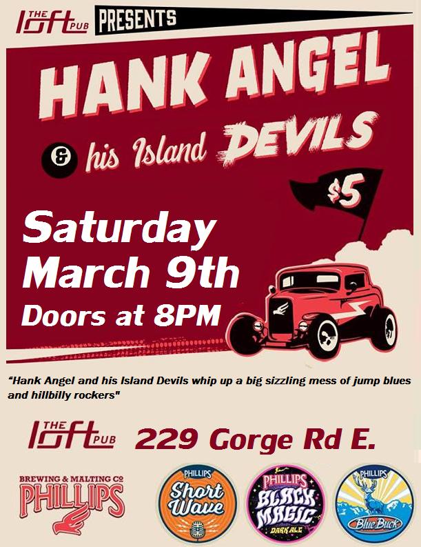 Hank Angel and his fabulous band - The Island Devils - return to Victoria's Diamond on the Gorge - The Loft Pub - for another fun night of Jump Blues and Rockabilly! Bring your dancin' shoes and come on down and celebrate the birthday of their special guest, SaxMan Extrodinaire - Sean Winter - and the lovely Kelly Ann!
