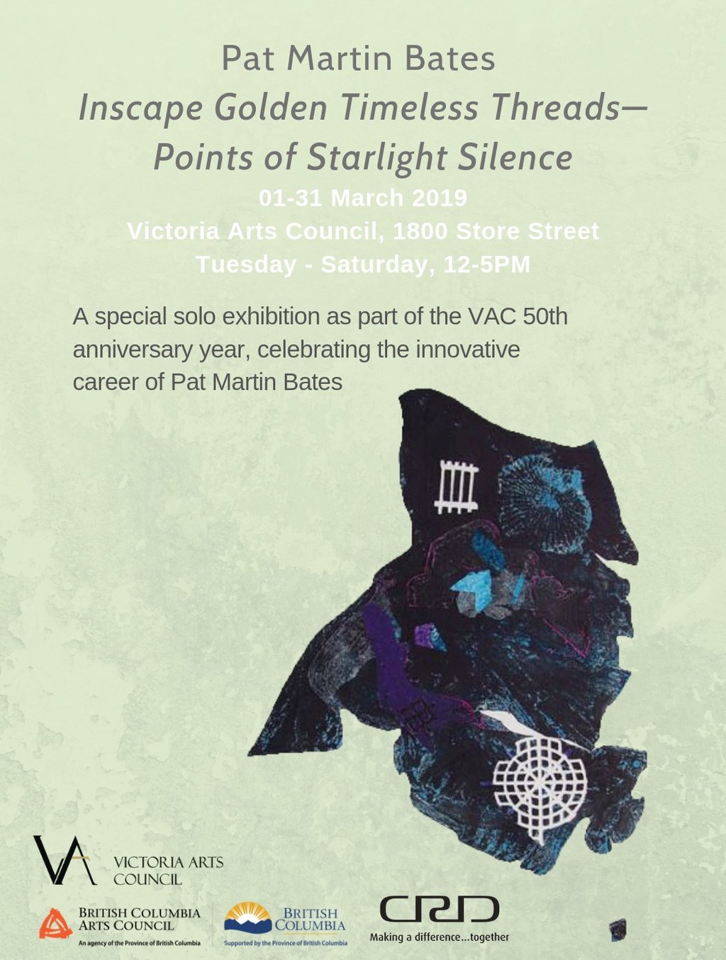 Please join us in celebrating the innovative career of one of Victoria's most accomplished visual artists -- Pat Martin Bates. This fifty-year survey exhibition takes a specific look at the experimental approaches the artist has explored and is being presented as a special project in honour of the Council's 50th anniversary year from 1-30 March.