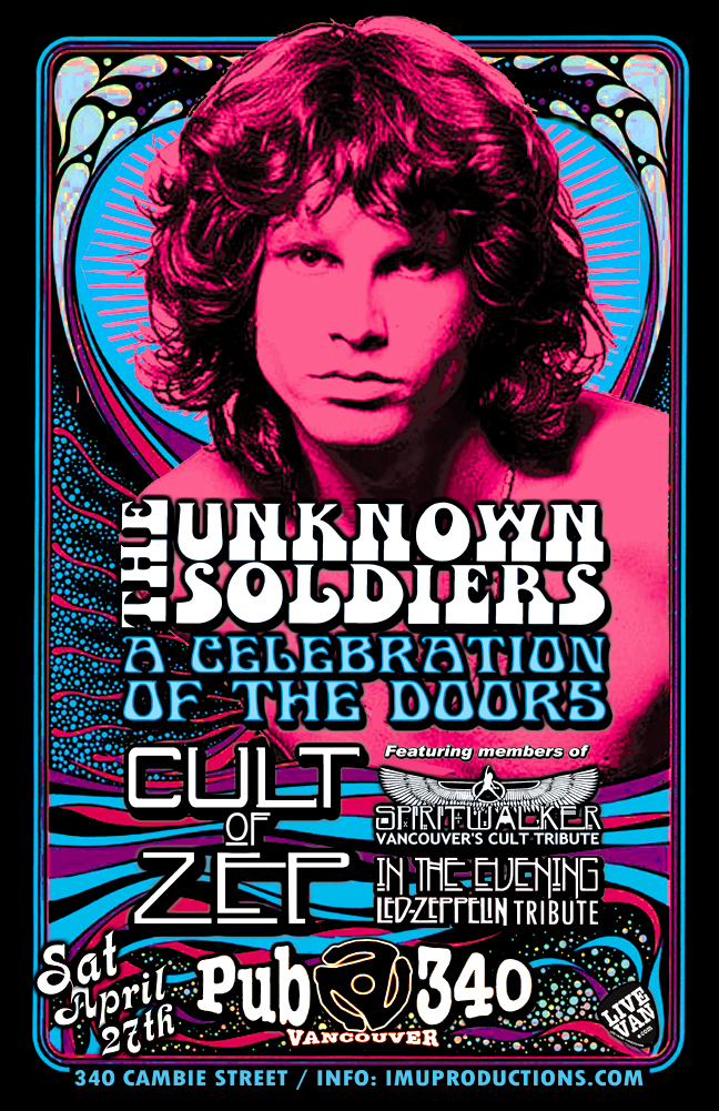 . Saturday, April 27th IMU presents The UNKNOWN SOLDIERS: A Celebration Of The Doors & CULT OF ZEP Led Zeppelin & The Cult Tribute @ Pub 340, 340 Cambie Street. Doors 8pm / Show 9:30pm / $10 cover