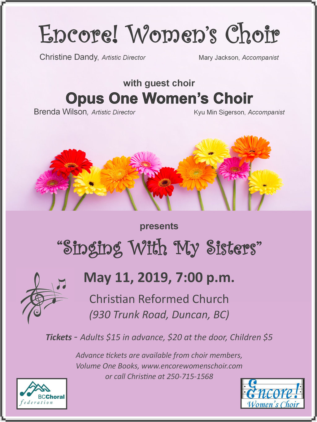 Encore! Women’s Choir under the direction of Christine Dandy is excited to present “Singing With My Sisters” with special guest choir Opus One Women’s Choir from Langley, BC.