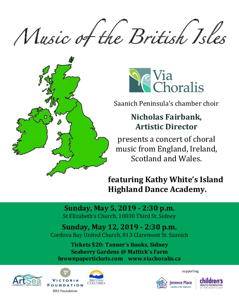 So much wonderful choral music comes from the British Isles, from folksongs and sea shanties to classical and contemporary works. In this concert Via Choralis, plus dancers from the Kathy White Academy and Collaborative Pianist Sandra Fletcher, bring you toe-tapping airs and beautiful melodies from 5 centuries, including excerpts from Benjamin Britten's "Choral Dances" from Gloriana and settings of folksongs by Canadian composers Mark Sirrett, Nicholas Fairbank and Jonathan Quick.