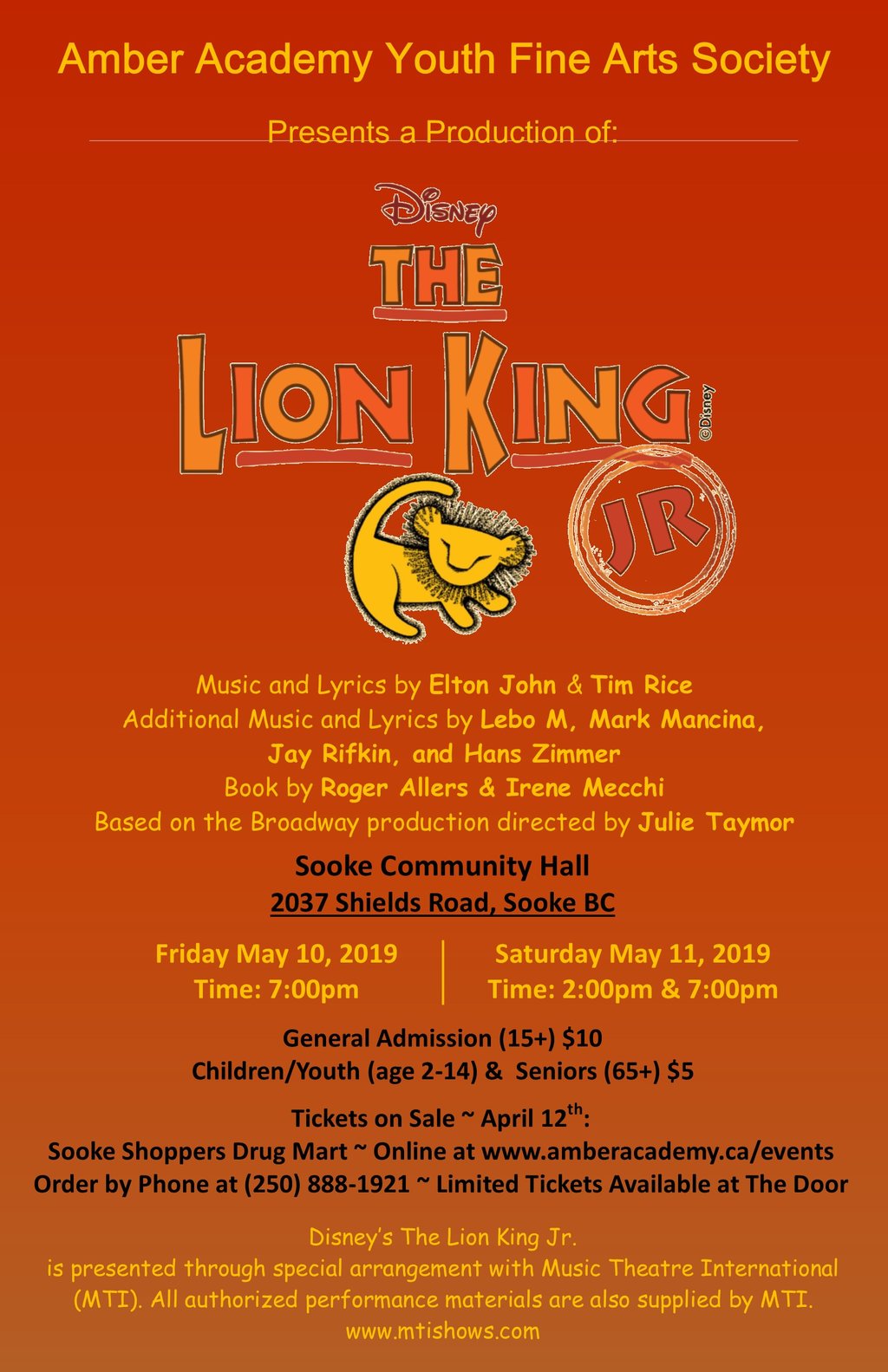 Disney's Lion King Jr.: Amber Academy Youth Fine Arts Society @ Sooke Community Hall May 11 2019 - Feb 8th @ Sooke Community Hall