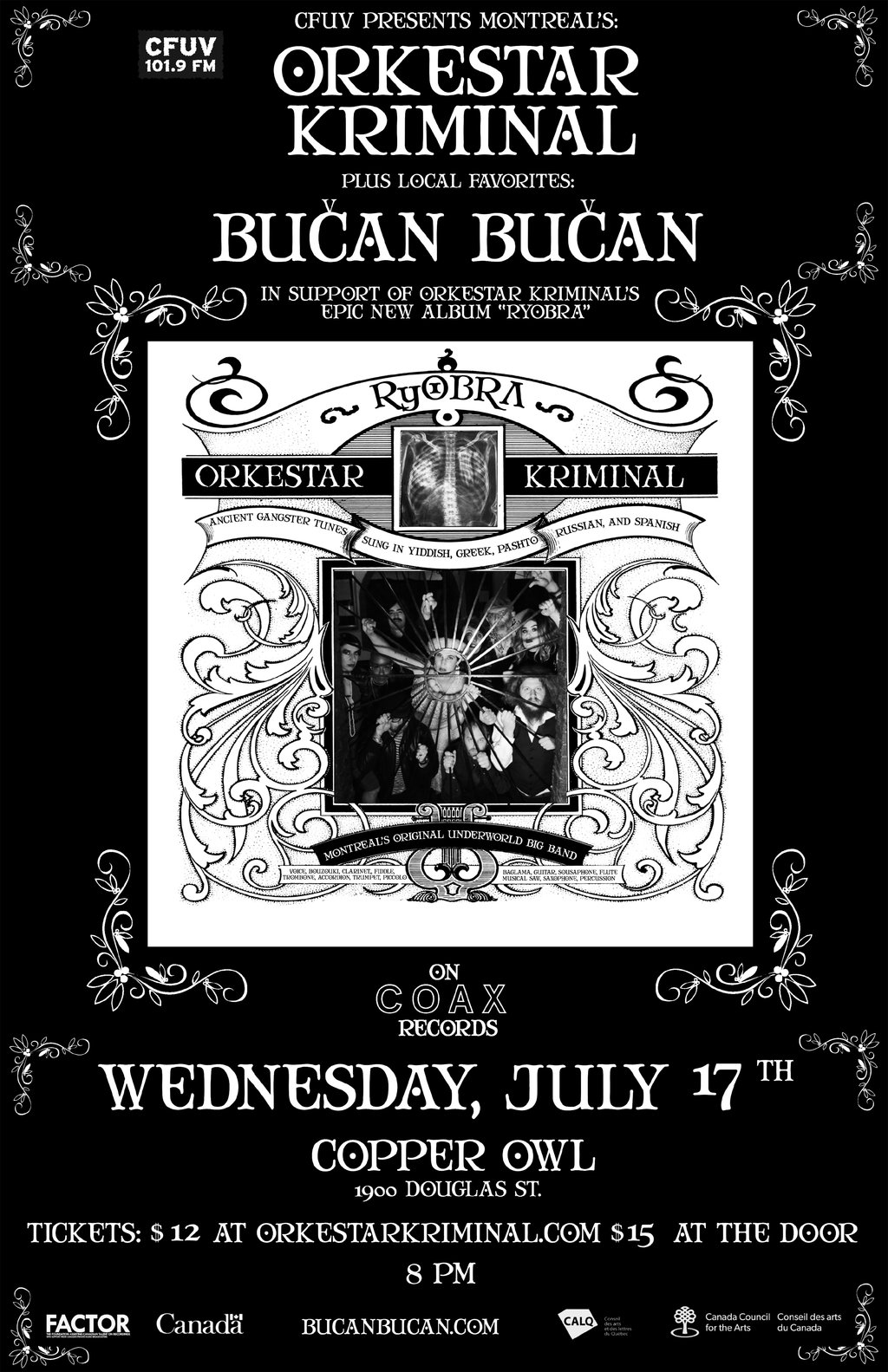 Orkestar Kriminal is comprised of 5 male and 5 female improv performers who interpret inspired renditions of slum-based "world music". They sing gutsy and adventurous criminal songs from a dangerous and forgotten era, like Mexican tequila-smuggling tunes, Russian prisoner laments, and the grooves of a Yiddish gangster. They can also be found performing in Pashto, Greek, Hebrew, or whatever other tongue might attract the multilingual stylings of front woman Giselle Claudia Webber. So long as the tune is catchy and a little shady, they'll give it their best shot. Orkestar Kriminal's debut album "Tummel" was released in 2015, attracting a plethora of media attention, and winning a GAMIQ for "Roots Album of the Year". After continuous touring and a multitude of festival performances, the biggest criminal punks in world music have just unleashed their 2nd full-length: Ryobra , with Producer Josh Dolgin, released August 24th, 2018 on Coax Records. In December, 2018 Ryobra hit the #1 spot on the Earshot “National International” college radio charts.