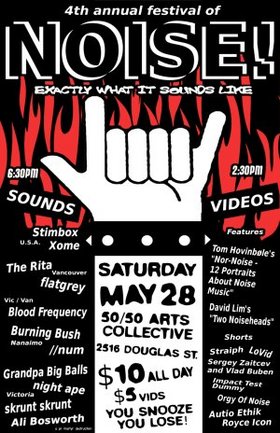 DIY production house PR Martyr is proud to announce that the fourth annual Noise! festival will be taking place here in Victoria, B.C., Canada on Saturday, May 28, 2005. The festival is an all day event focussing on (surprise) noise based musics and media and will be featuring the talents of artists from Canada and the US creating sounds ranging from harsh digital noise to strange ambient to crazy performance art to outsider freakout and back again. Decent PA, video projection, merch table and lots and lots of noise. This is the real deal.