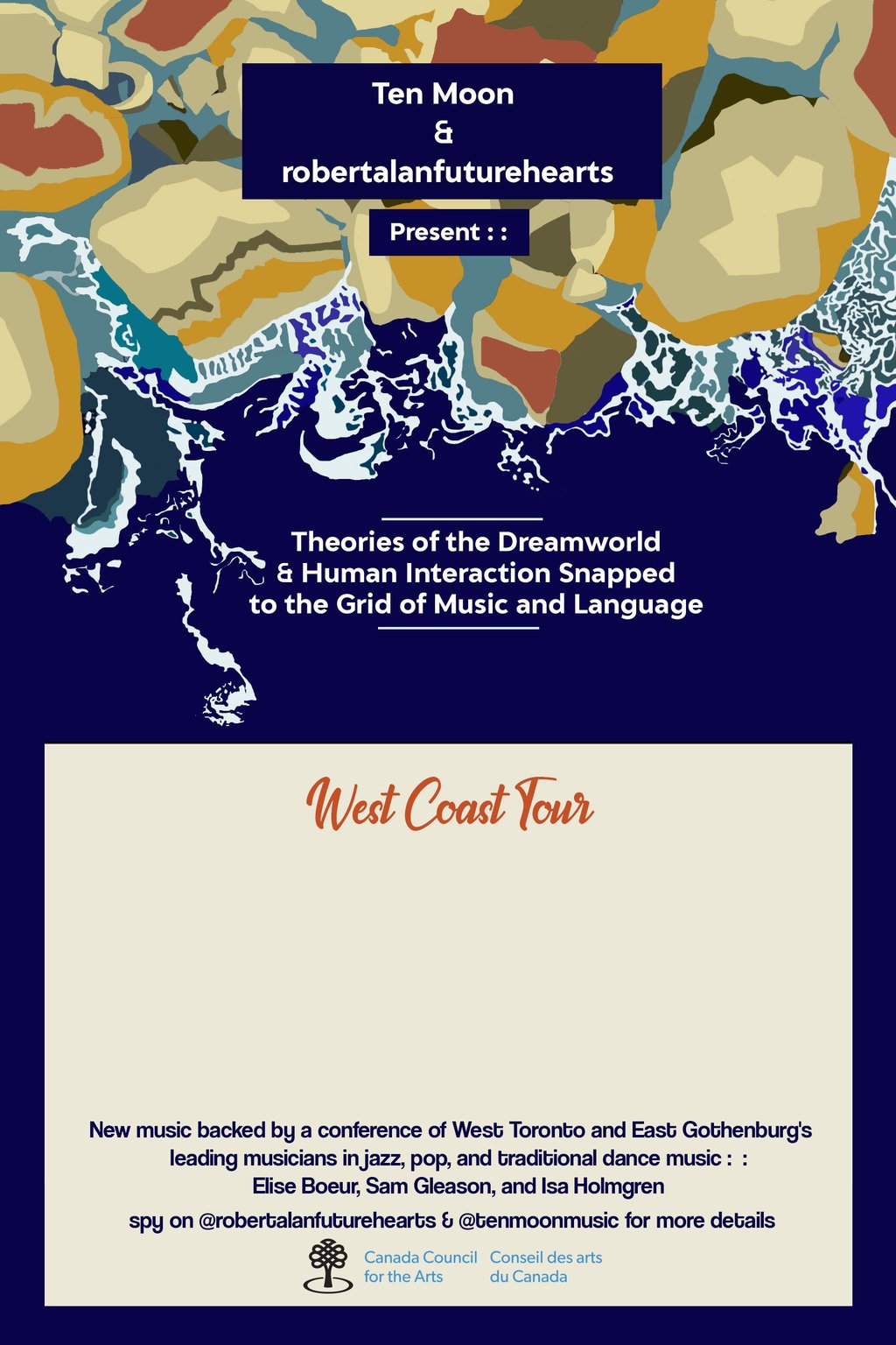 Ten Moon offers an escape into lucid dream soundscapes. Resonant alto vocals and gut punches of bass intertwine with shimmers of electric guitar and violin to cocoon lyrics about one way tickets to space, ice storms, and whale bones. Ten Moon’s first solo album, Exit West, is slated for a fall 2019 release and features many of the musicians you will hear at this beautiful event.