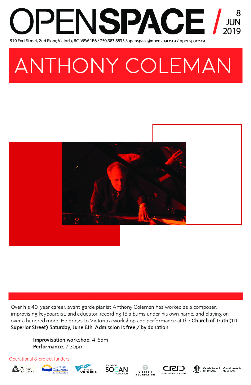 Over his 40-year career, avant-garde pianist Anthony Coleman has worked as a composer, improvising keyboardist, and educator, recording 13 albums under his own name, and playing on over a hundred more. He brings to Victoria a workshop and performance at the Church of Truth (111 Superior Street) Saturday, June 8th. Admission is free / by donation.
