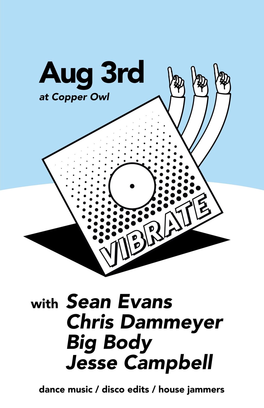 We're very excited to host another night of rollers with some top quality pals. Sean Evans, Chris Dammeyer, Big Body and Jesse Campbell are taking over Copper Owl for a night of disco edits, house anthems, and whatever the heck else we feel like playing. VIBRATE aims to create a comfortable and safe space to enjoy electronic music, a place to share new music and explore new sounds, and a chance for up and coming DJs to rinse their tunes. All are welcome.