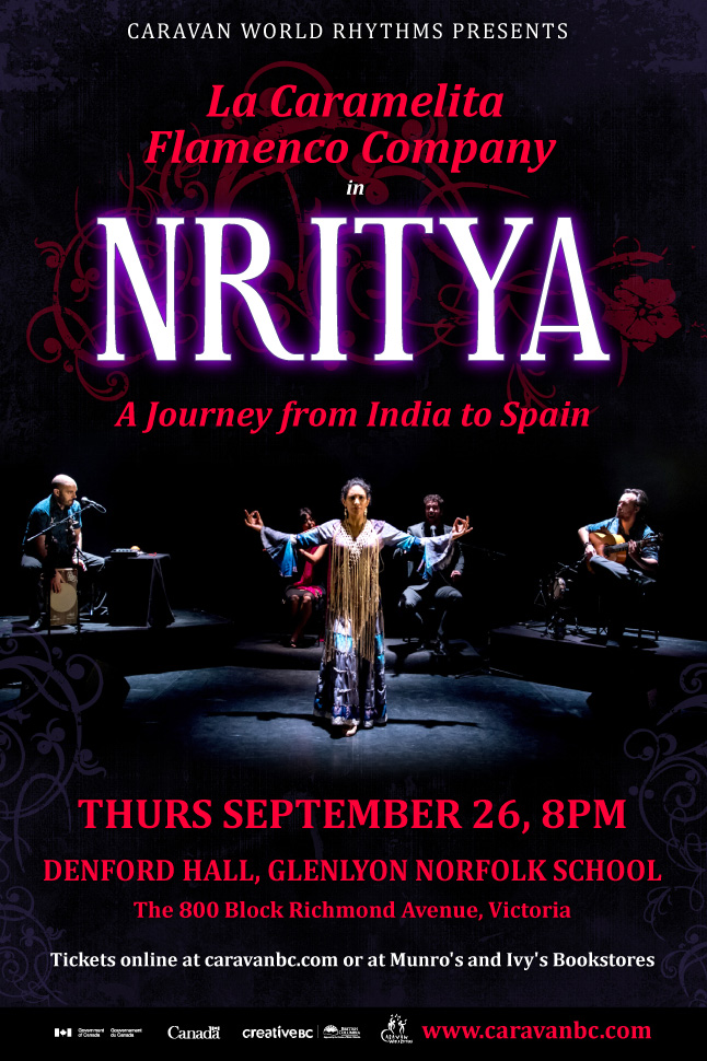 Caravan World Rhythms presents the North American premiere of La Caramelita Flamenco Company in “Nritya” – a Voyage of Rhythm, Music and Dance from India to Spain.The company includes performers from Spain, France and Canada, including dancer/artistic director Deborah “La Caramelita”, Alejandro Mendía on vocals, Guillermo Guillén on guitar, Alex Carrasco on percussion and Lara Wong on flute and bansuri.As a first generation Canadian, born to Malaysian parents of South Indian descent, Deborah “La Caramelita” has enchanted international audiences for over 10 years with her unique style of dance. Her new show “Nritya” tells Deborah’s story through dance, a story of an immigrant family and an artist connecting with an art form that seems totally foreign, but one that she is historically linked with.