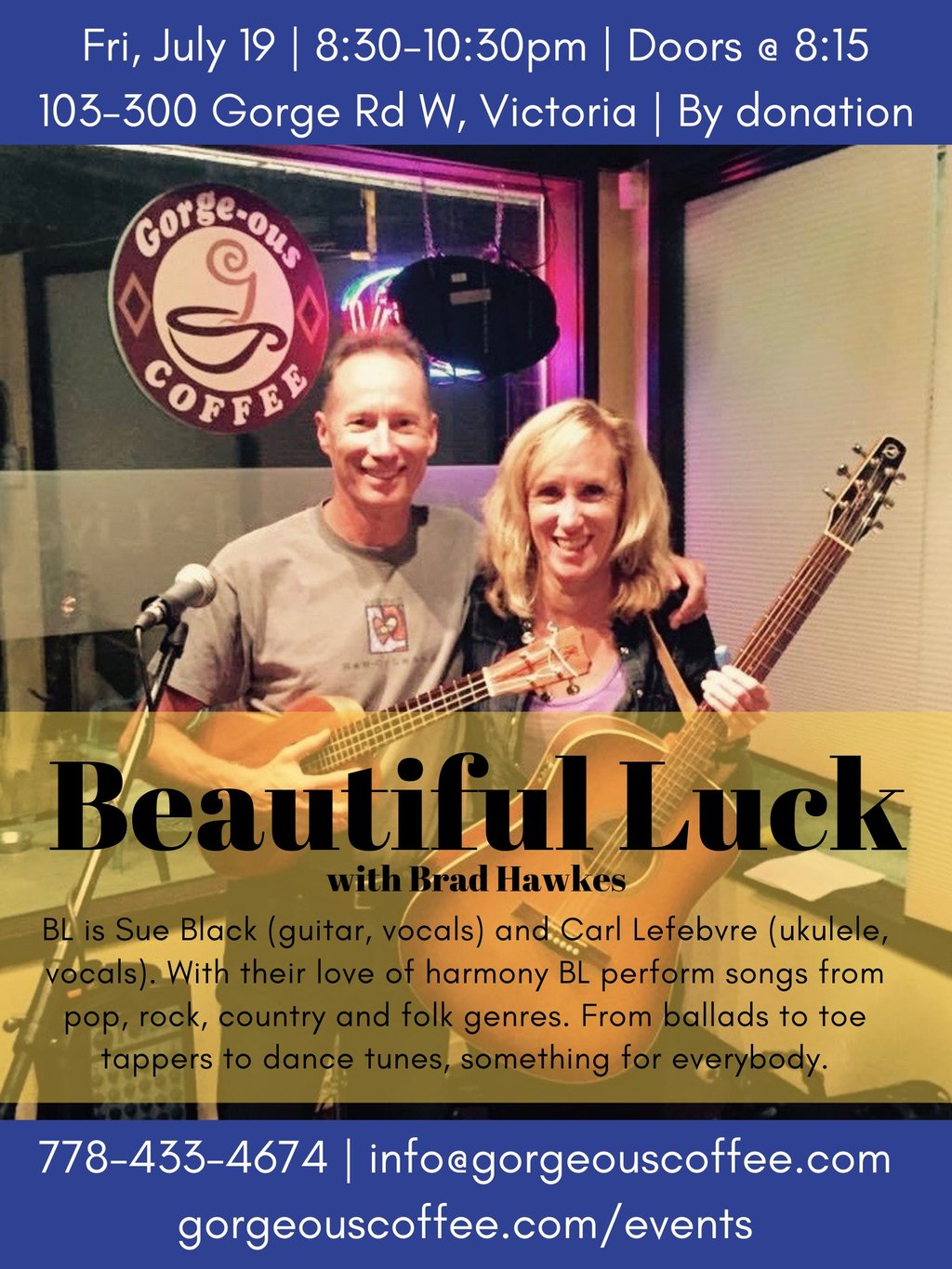 Beautiful Luck is Sue Black (guitar, vocals) and Carl Lefebvre (ukulele, vocals). With their love of harmony BL perform songs from pop, rock, country and folk genres. From ballads to toe tappers to dance tunes, there's something for everybody. With Brad Hawkes.