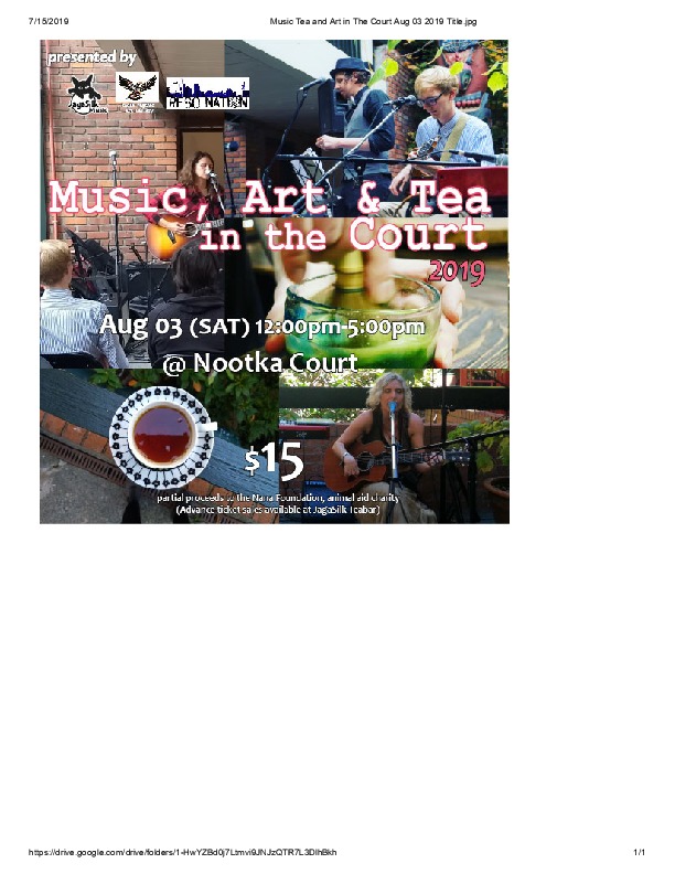 Music, Art and Tea in the Court, Saturday, August 3rd. 12:00 pm - 5:00 pm. Enjoy our afternoon festival in the warm ambience of Nootka Court. Partial proceeds to the Nana Foundation, animal aid charity. The Teabar will be open with light food menu.