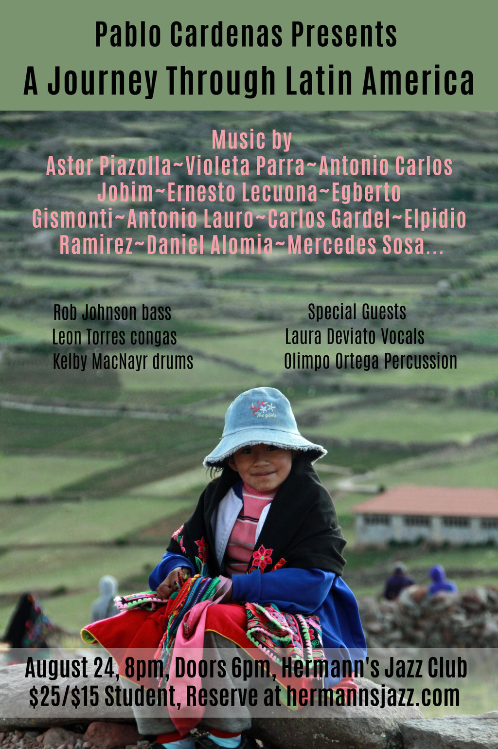 Pablo Cardenas is doing a tribute to Latin American musical legacy at Hermann’s Jazz Club, music from Brasil, Argentina, Peru, Venezuela, Mexico, Cuba and more. On the line up, Kelby MacNayr on drums, Leon Torres on congas, special guests Olimpo Ortega on Latin percussion, Laura Nicolina on vocals.