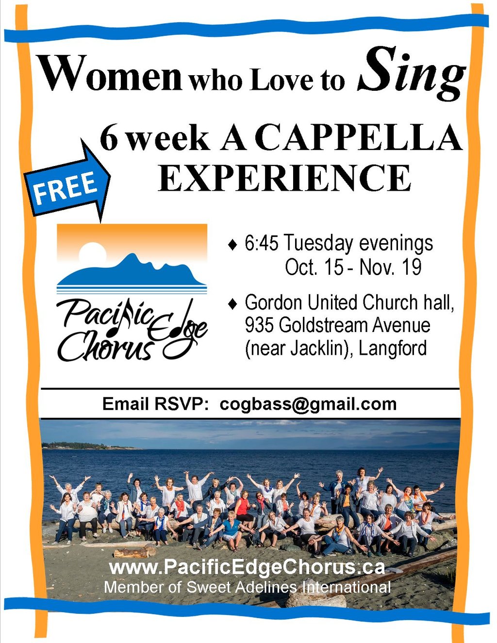 FREE 6 WEEK A CAPPELLA EXPERIENCE for WOMEN: PACIFIC EDGE CHORUS @ Gordon United Church Hall Oct 22 2019 - Feb 8th @ Gordon United Church Hall
