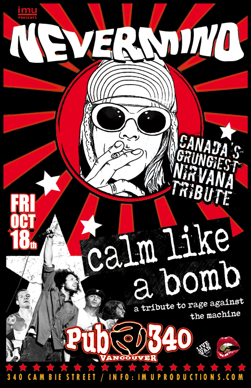 . Friday, October 18th IMU presents NEVERMIND Nirvana Tribute & CALM LIKE A BOMB Rage Against The Machine Tribute @ Pub 340, 340 Cambie Street. Doors 8pm / Show 9:30pm / $10 cover