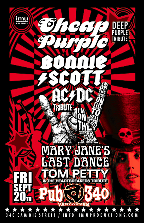 . Friday, September 20th IMU presents CHEAP PURPLE Deep Purple Tribute, BONNIE SCOTT AC/DC Tribute & MARY JANES LAST DANCE Tom Petty & The Heartbreakers Tribute @ Pub 340, 340 Cambie Street. Doors 8pm / Show 9:30pm / $10 cover