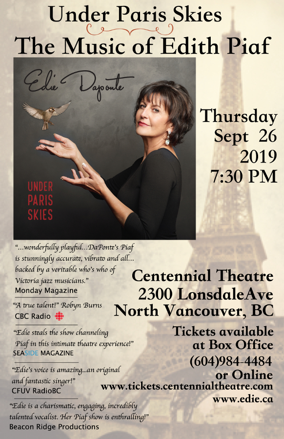 Non Je Ne Regrette Rien; La Vie En Rose; Sous Le Ciel de Paris; Milord and many more in both French and English as well as songs that fit alongside Piaf’s oeuvre. Joining Edie are long-time collaborator, Joey Smith on bass and Vancouver Island favourites, Karel Roessingh on piano, Aaron Watson on accordion and guitar and Jonathan Eng on percussion.