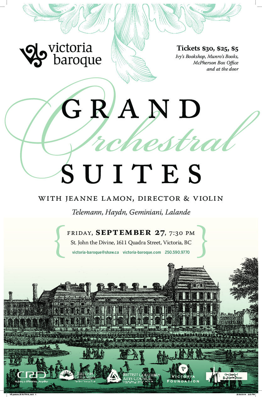 The legendary violinist and long-time music director of Toronto’s Tafelmusik Baroque Orchestra, Jeanne Lamon, leads sixteen members of Victoria Baroque in a selection of grand Overture Suites and ravishing Concerti Grossi celebrating the first-ever public concert series in Paris. Formed in 1725, Le Concert Spirituel brought music – previously exclusive to the courts – to the public realm, and became a platform to the finest of the French and touring artists. This concert revels in the splendours of the French Suite, Italian Concerto and Classical Symphony, and the contrast and blending of distinct national styles at what became the most acclaimed and imitated concert series in the 18th century Europe.